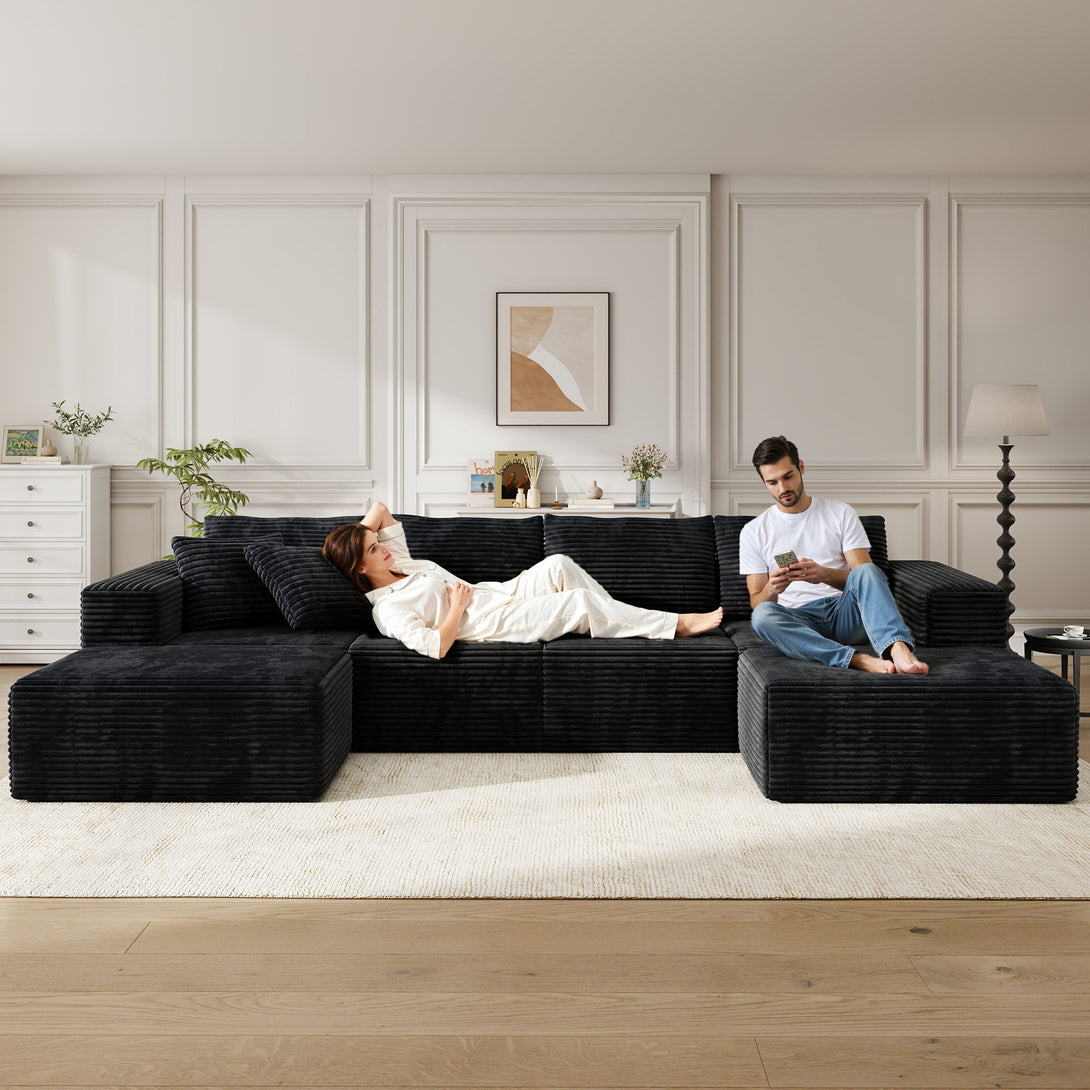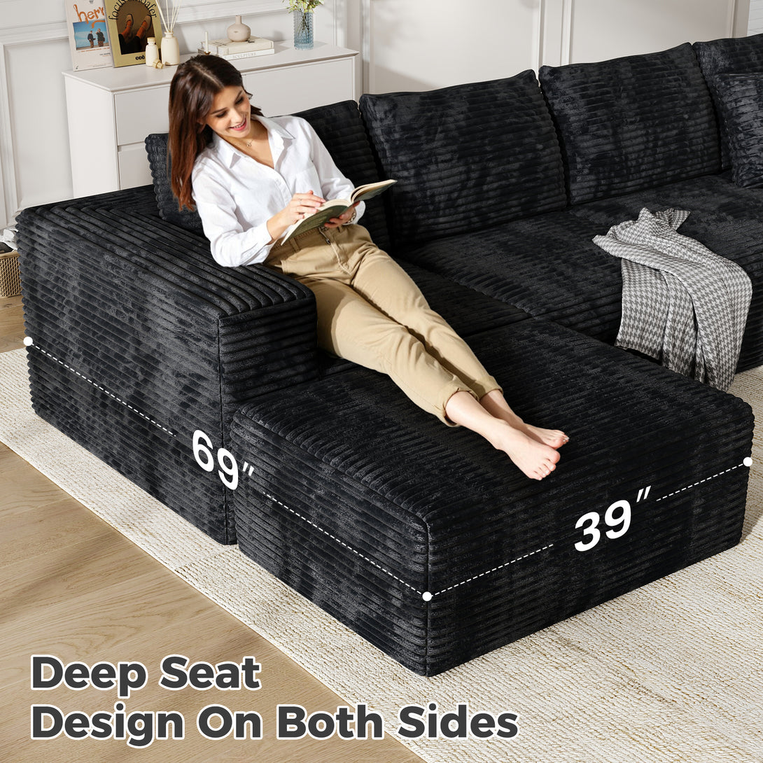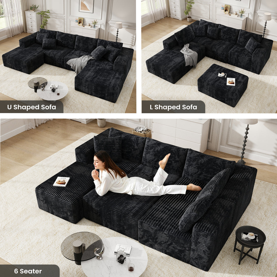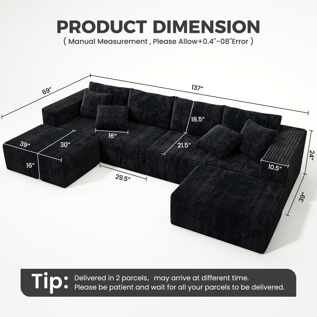137" Cloud Sectional Couch, Modular U-Shaped sectional sofa with Chaise and Ottoman, Modern Minimalist Sleeper Couch with Deep seats L Shaped for Living Room, Plush Corduroy Sofa, no assembly , Black