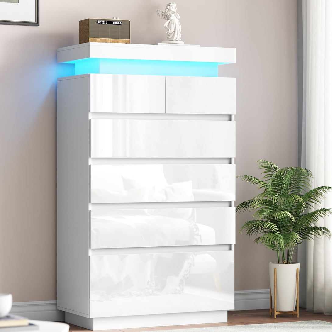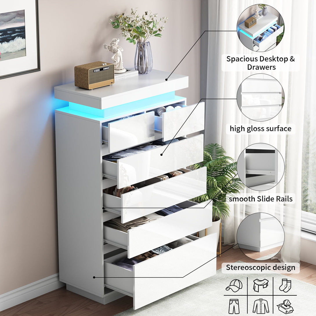 6 Drawers Dresser, Modern Tall Dresser for Closet with Adjustable LED Lights, High Gloss Chests of Drawers, Wood Storage Cabinet for Bedroom, Entryway, Living Room, Dressing Room, White