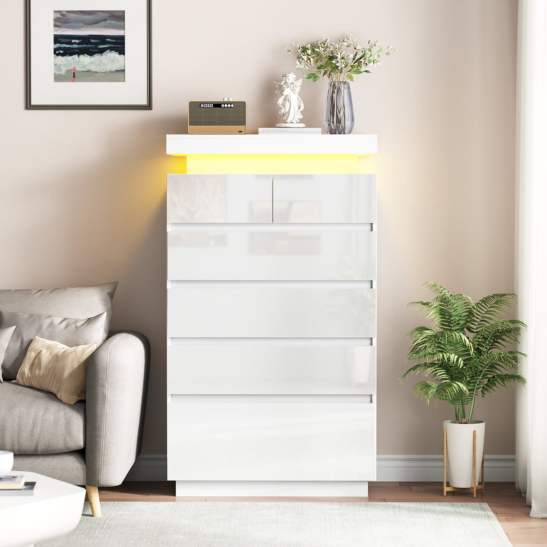 High Gloss 6 Drawer Dresser with Lights - The high gloss design of the visual surface creates a modern and spacious look. The light on top of the dresser can be switched in multiple colors to create a stunning ambiance, making it the focal point of the bedroom. Create a better life with Seeday!