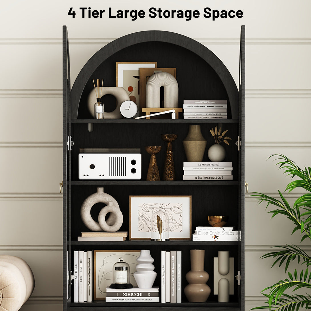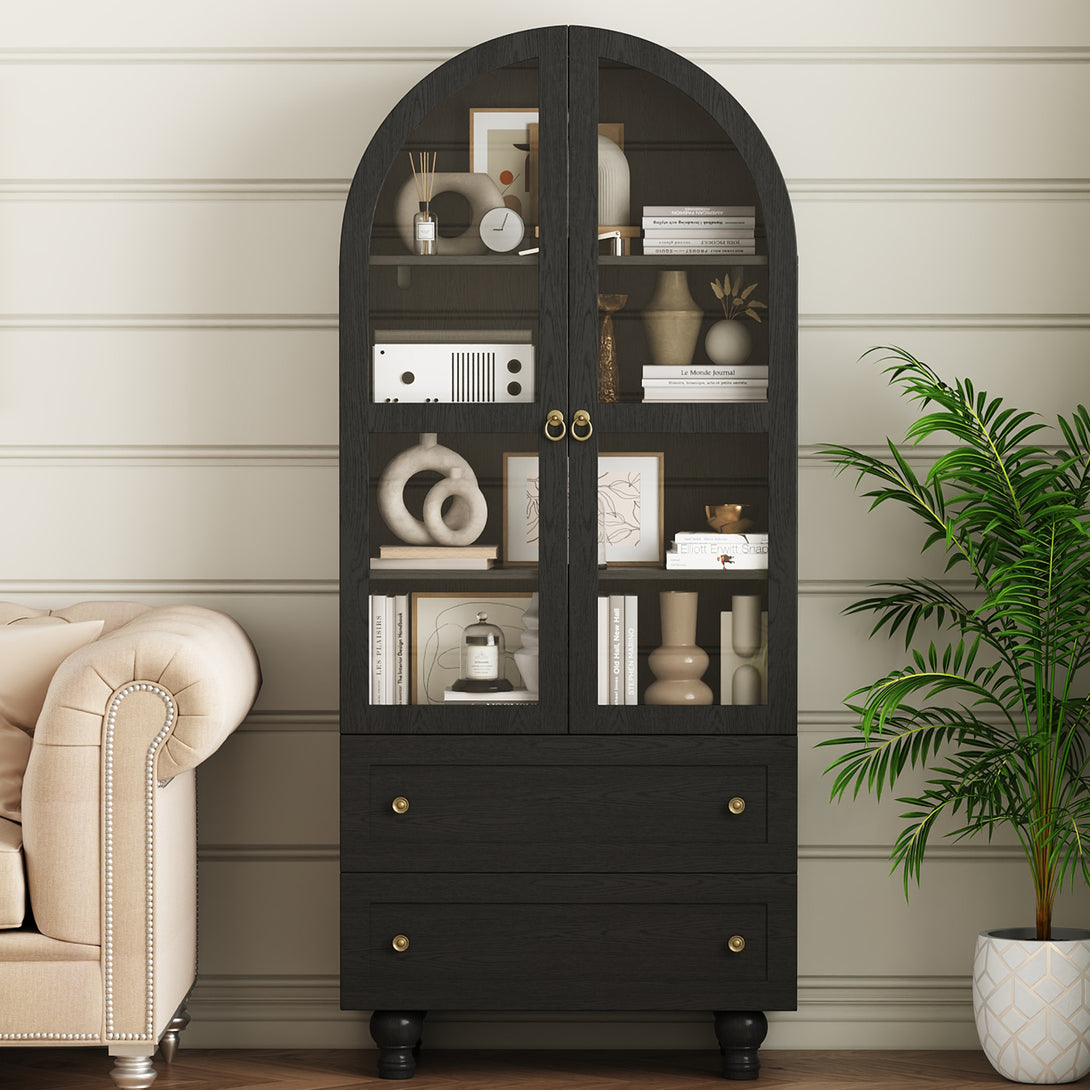 IDEALSOUL Arched Kitchen Pantry Cabinet, 70" Tall Wood Storage Cabinet with 2 Glass Doors,4 Shelves and 2 Drawers, Food Cabinet For Kitchen, Living Room, Bedroom(Black)