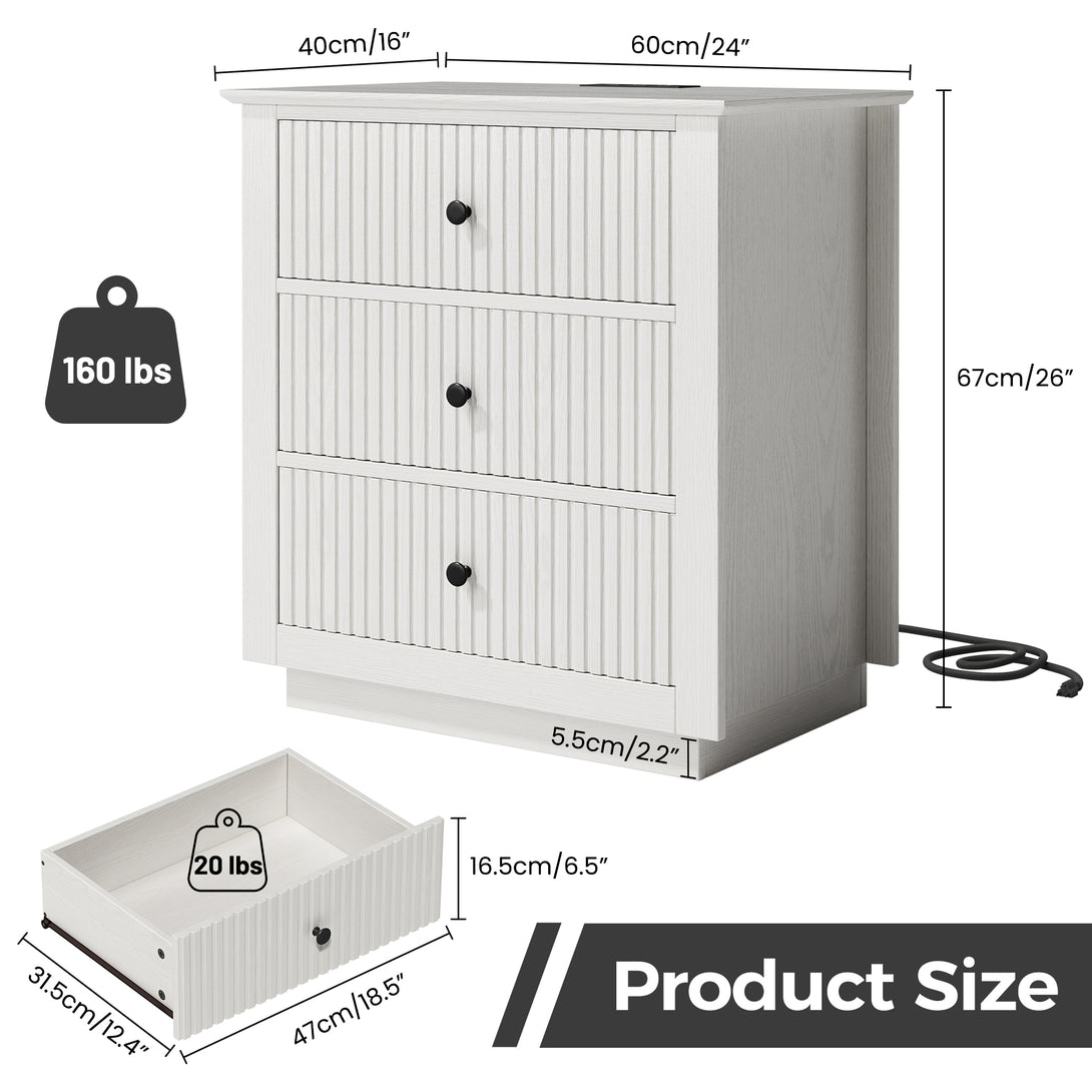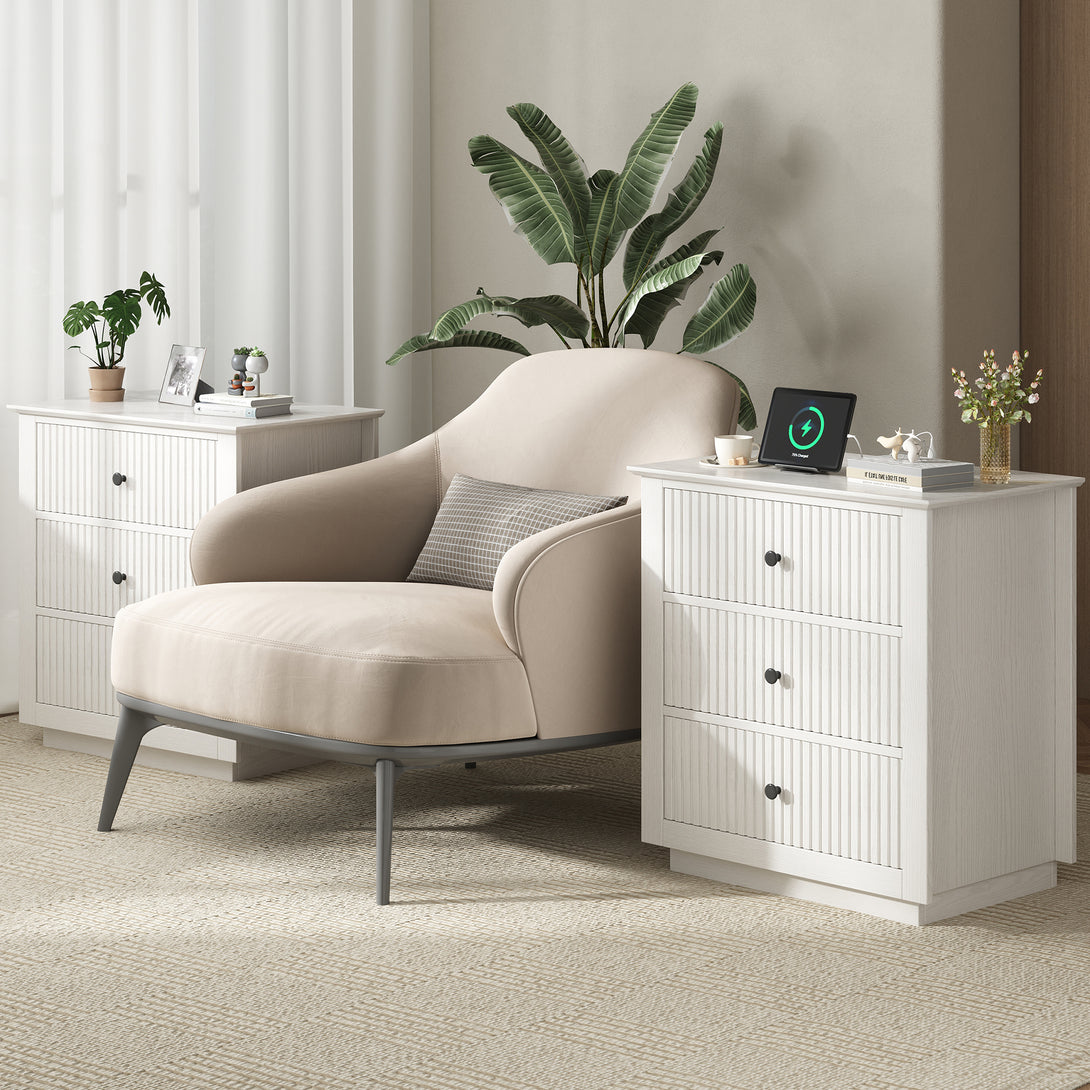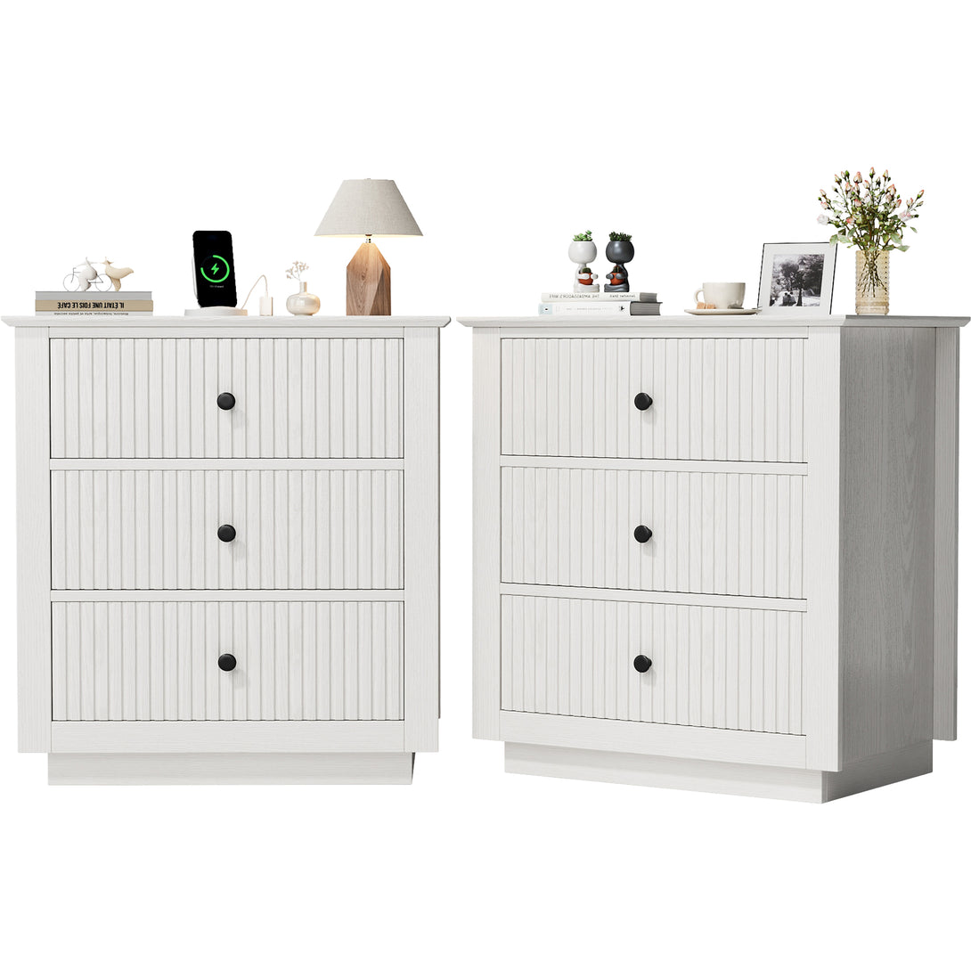 IDEALSOUL Nightstand Set of 2, 24" Wide End Table with Storage, Fluted Nightstand with USB Charging Station, Large 3 Drawers nightstand for Bedroom Living Room(2pc, White)