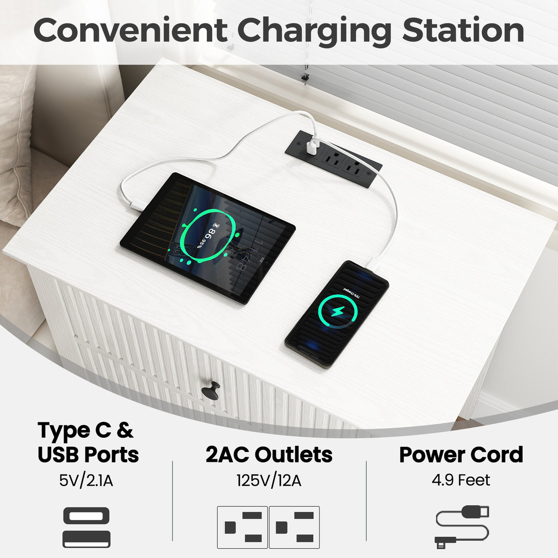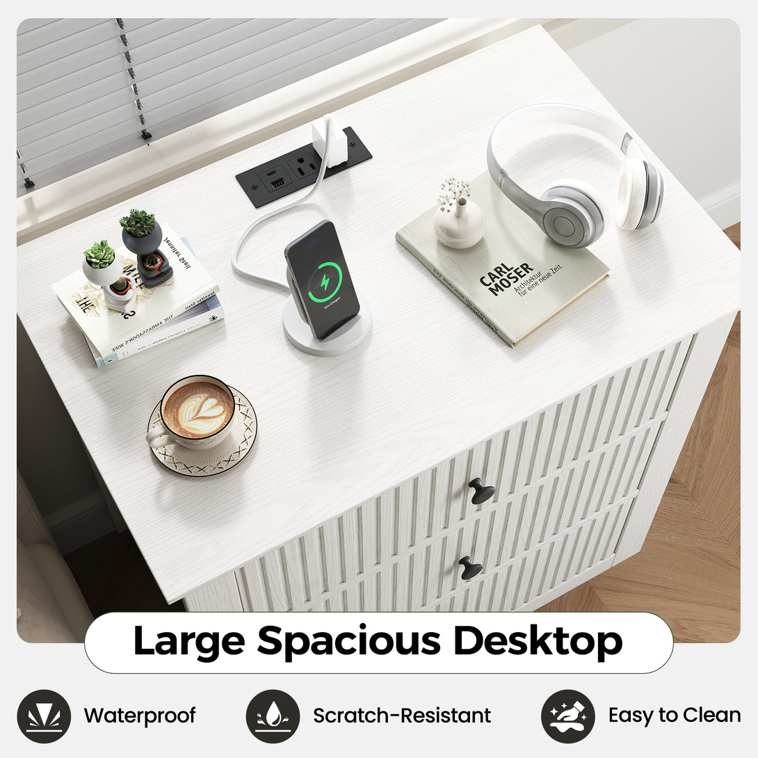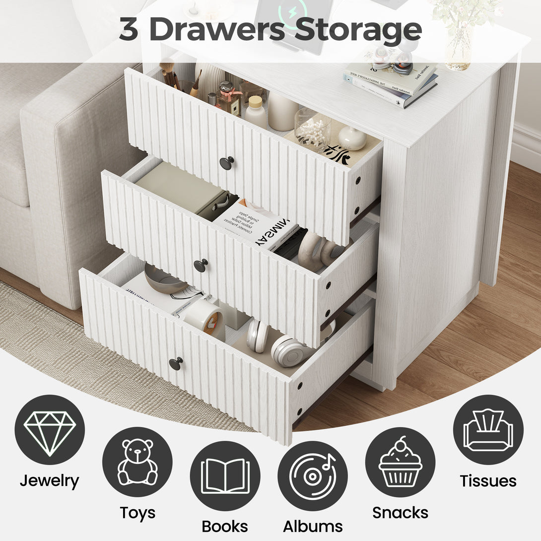 IDEALSOUL Nightstand Set of 2, 24" Wide End Table with Storage, Fluted Nightstand with USB Charging Station, Large 3 Drawers nightstand for Bedroom Living Room(2pc, White)