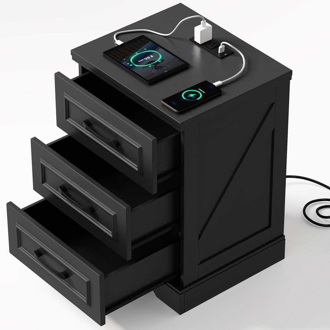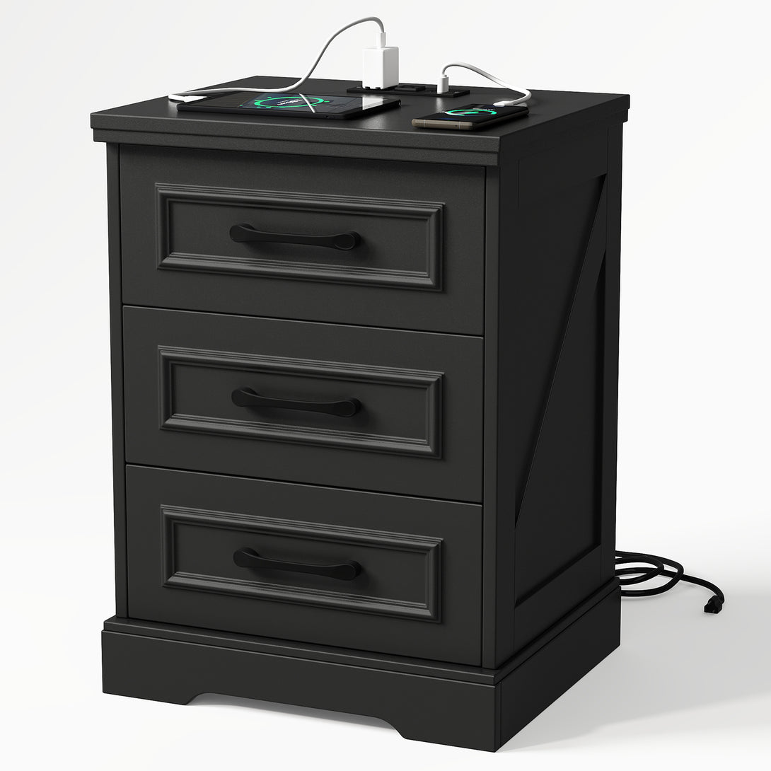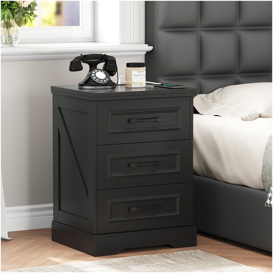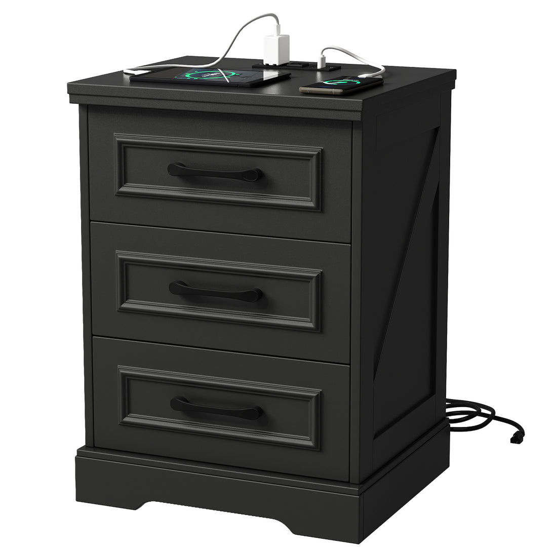 IDEALSOUL Nightstand for bedroom,Black Farmhouse End Table with Charging Station,3 Drawers Storage