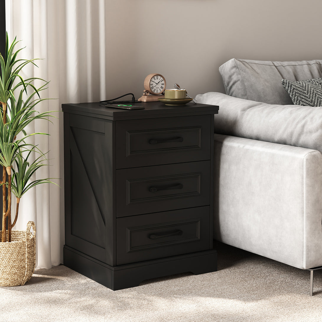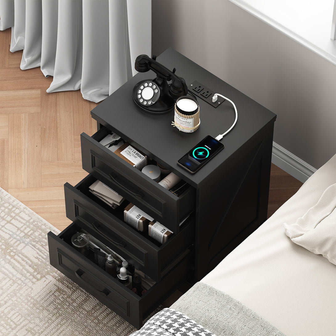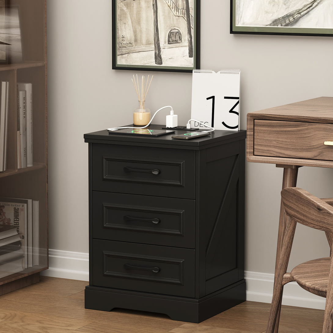 IDEALSOUL Nightstand for bedroom,Black Farmhouse End Table with Charging Station,3 Drawers Storage