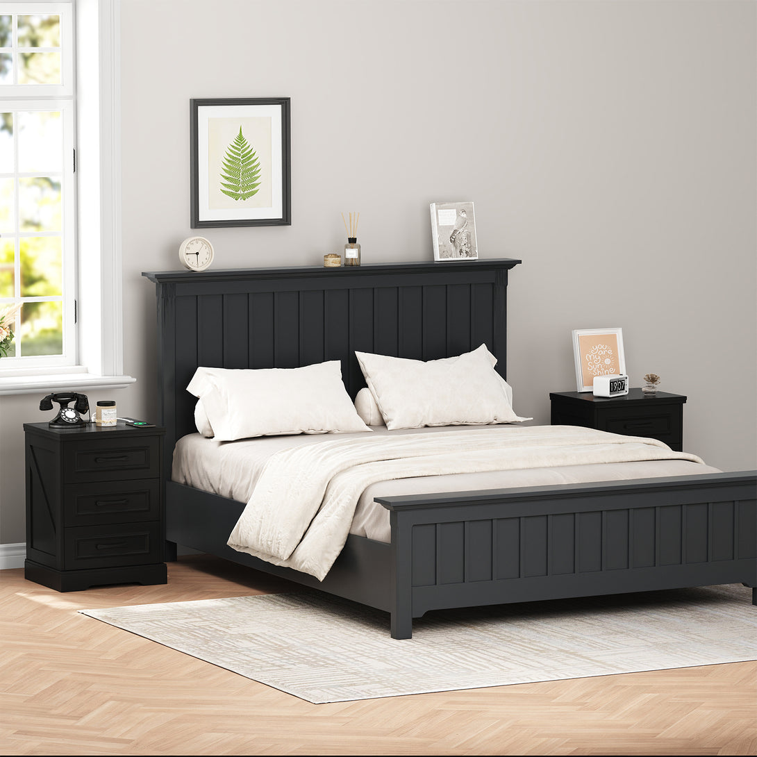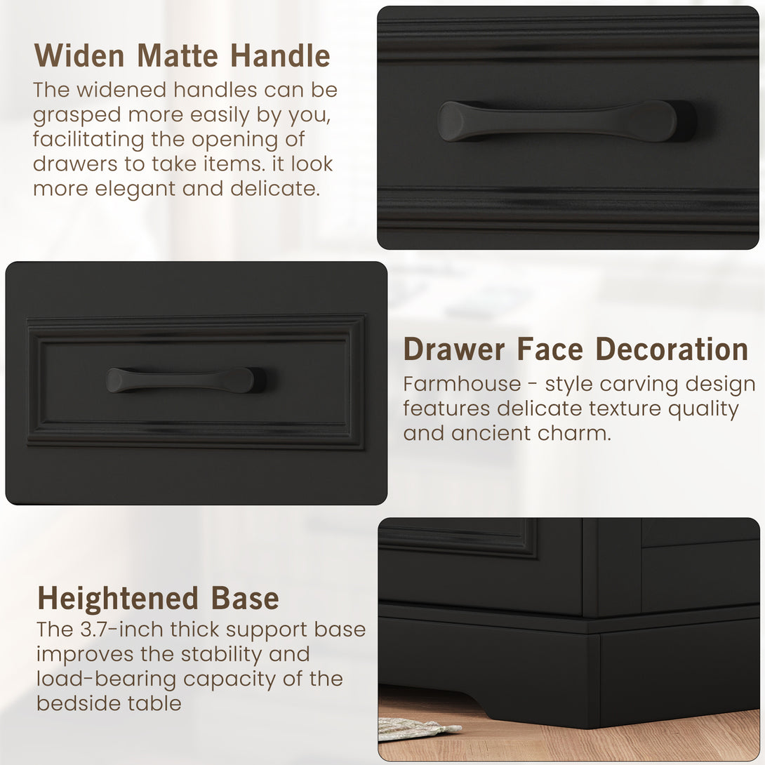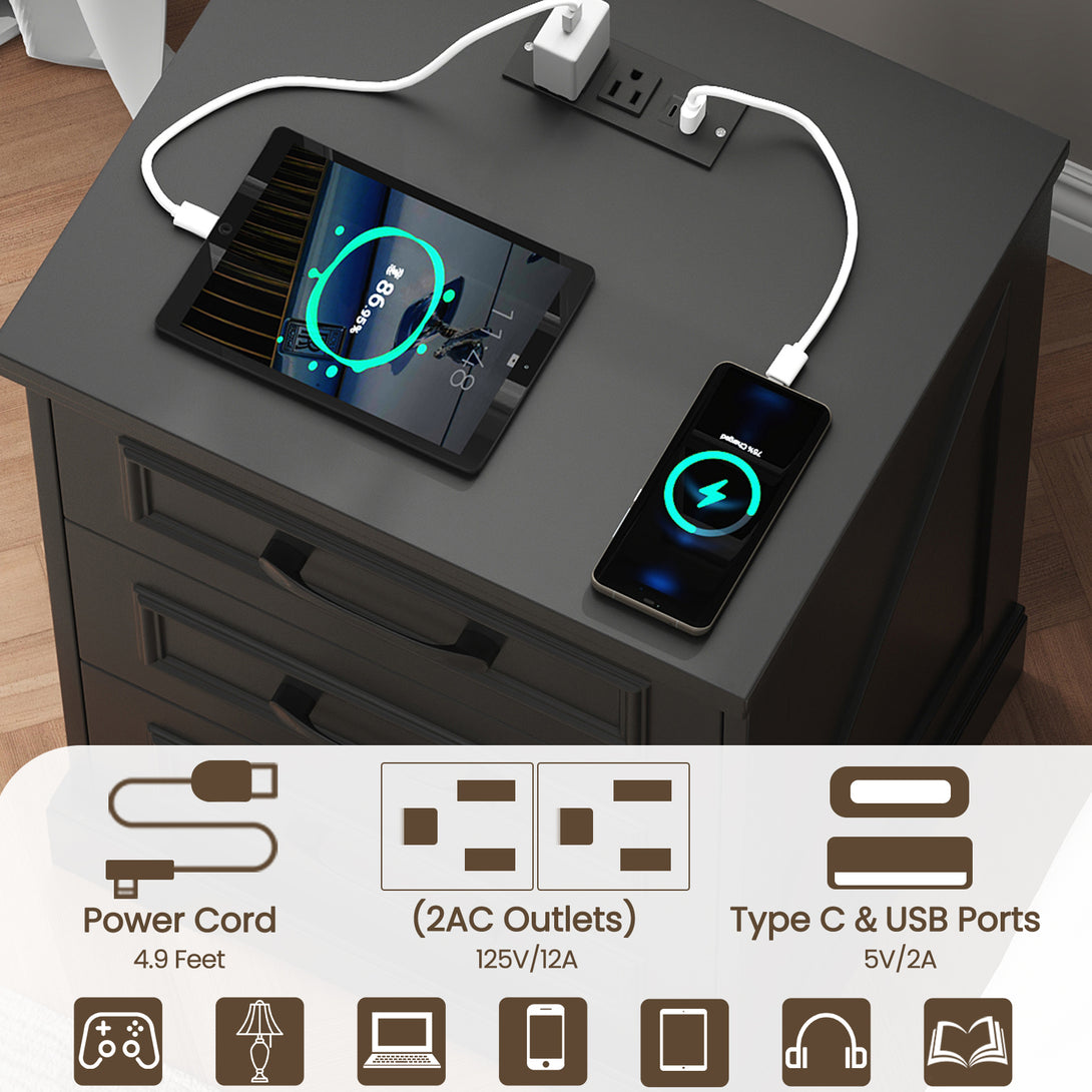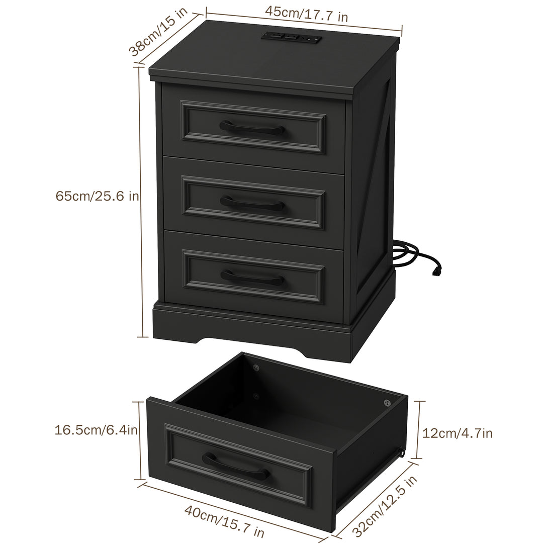 IDEALSOUL Nightstand for bedroom,Black Farmhouse End Table with Charging Station,3 Drawers Storage