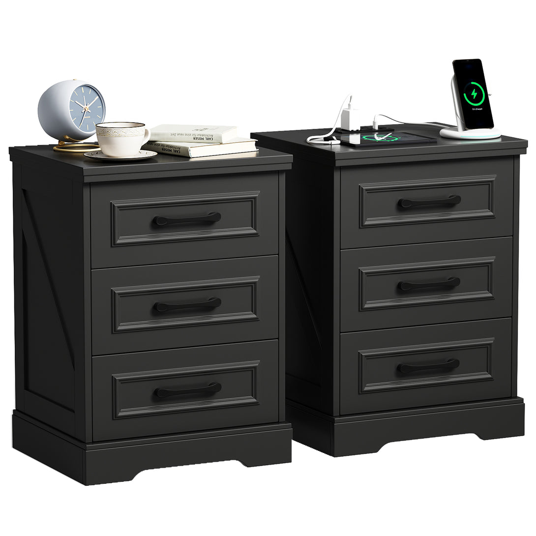 IDEALSOUL Nightstand Set of 2,Black Farmhouse End Table with Charging Station,3 Drawers Storage