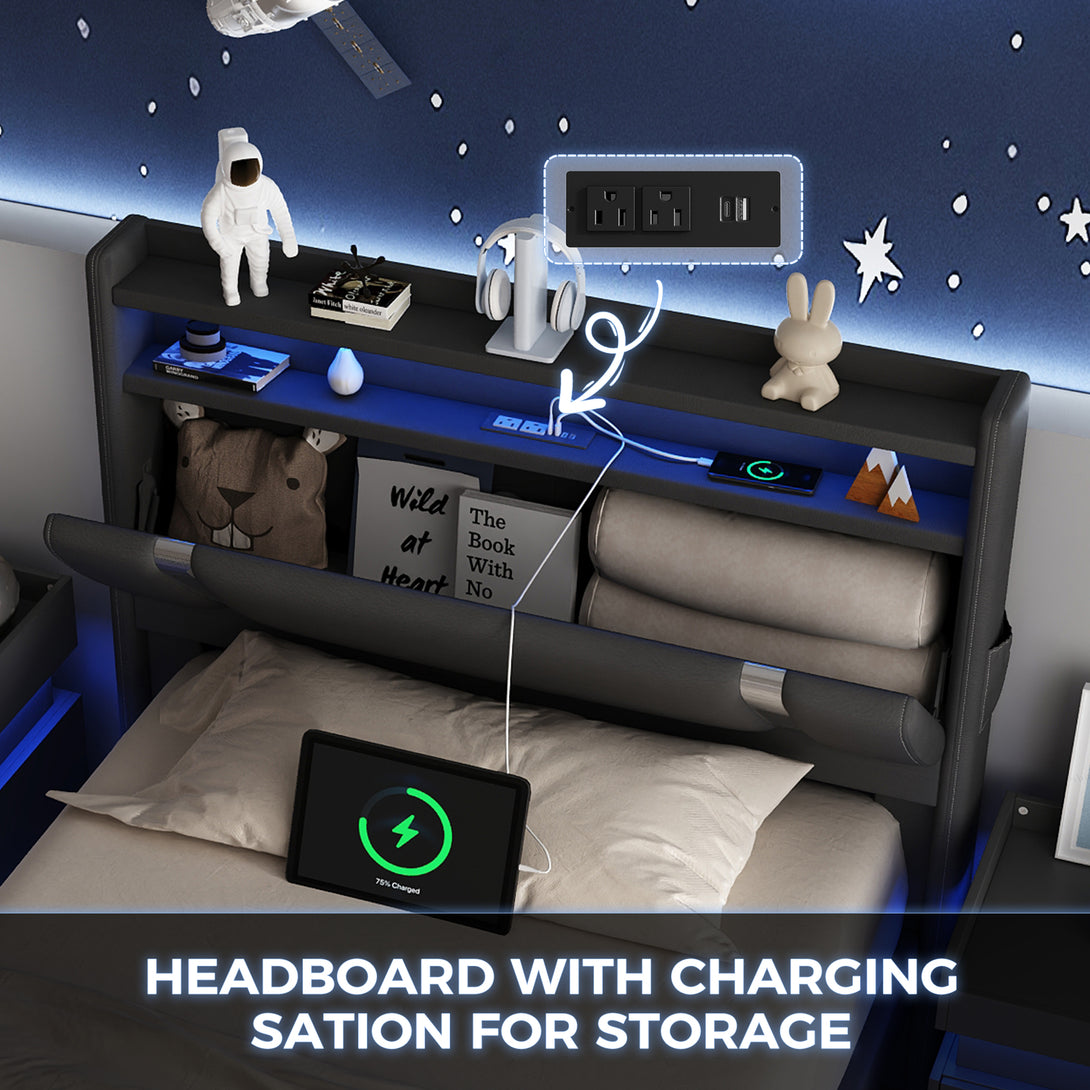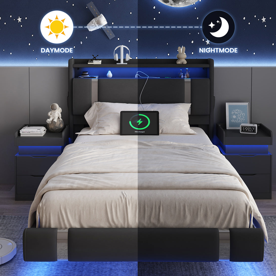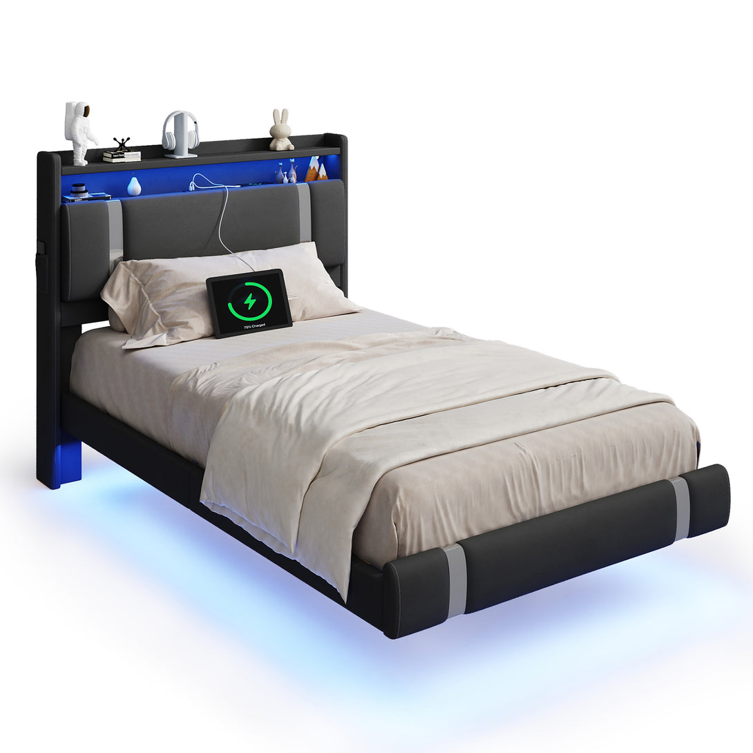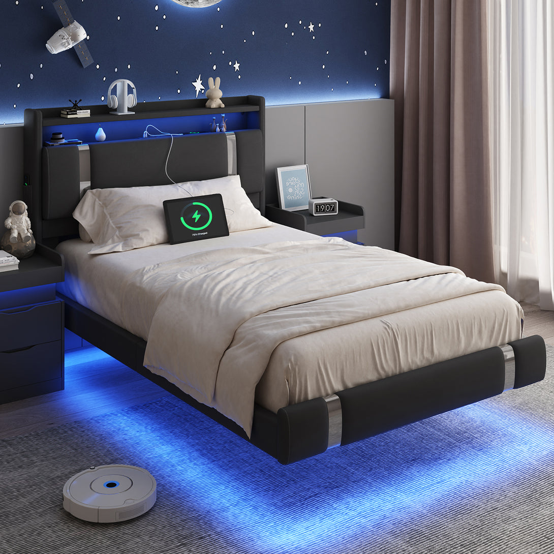 IDEALSOUL Twin Size Bed Frame with LED Lights,Floating Metal Platform Bed with Storage Headboard,No Box Spring Needed,Easy to Assemble (Twin,Black)