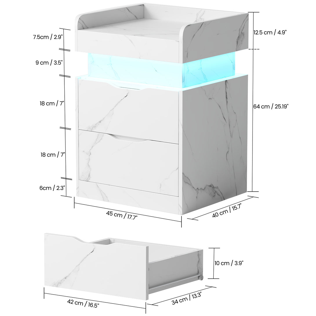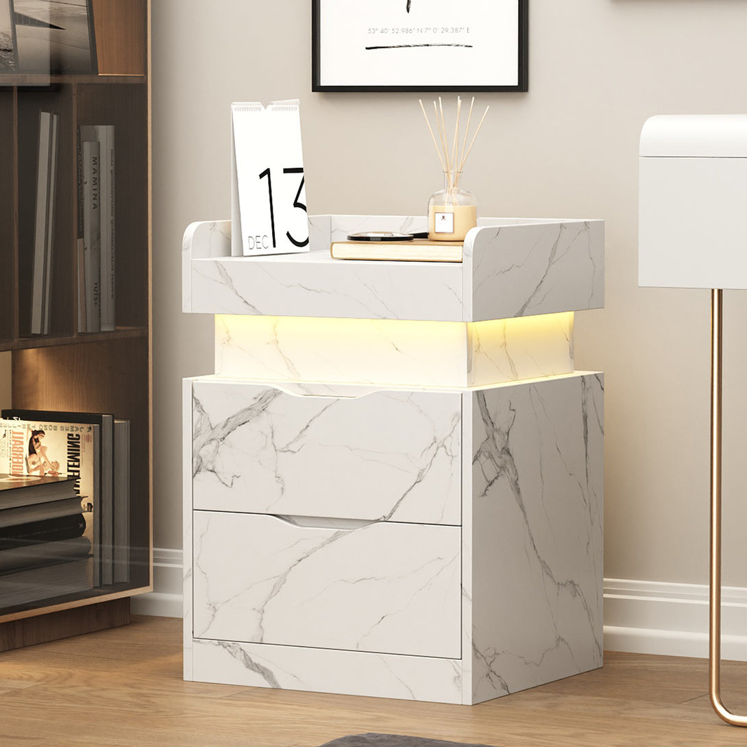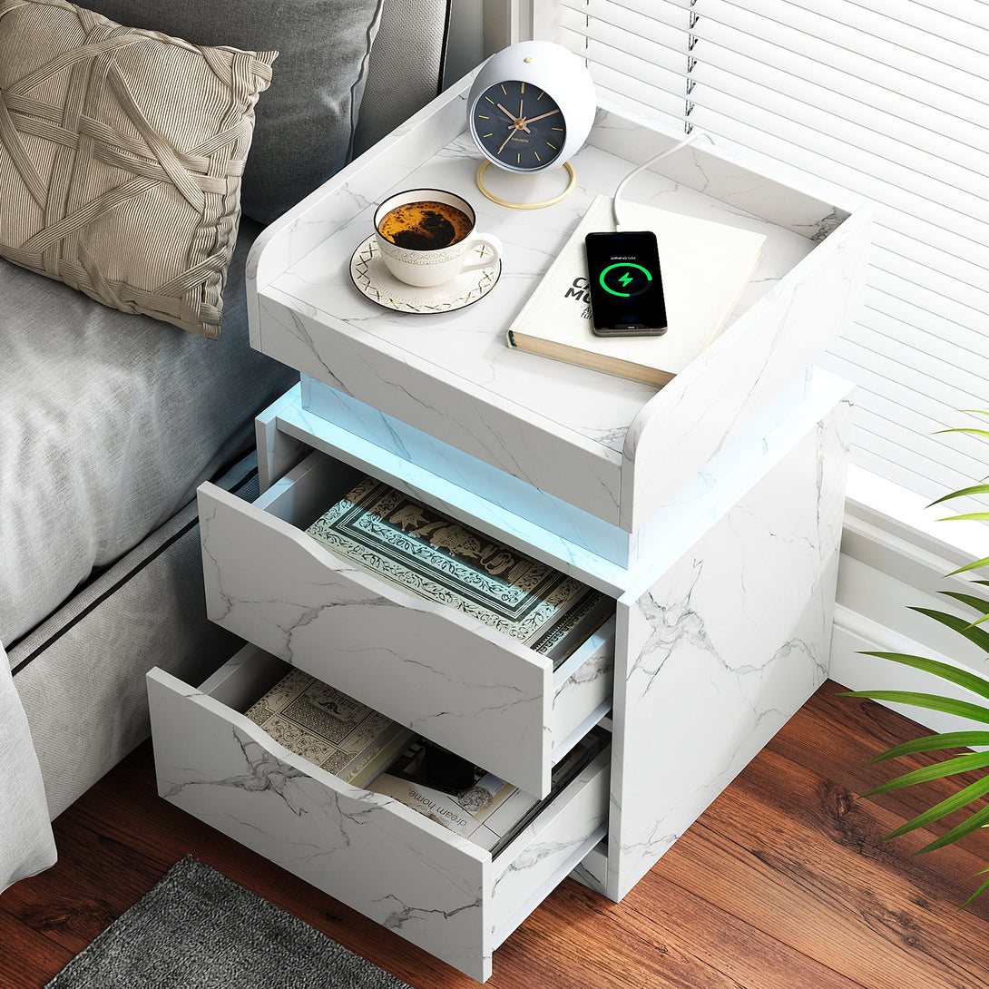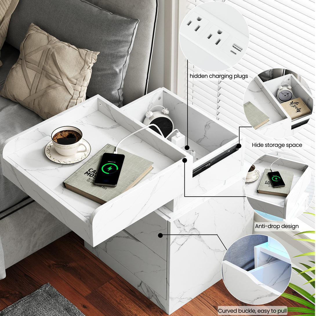 Nightstand Set of 2 with Charging Station, White Bedside Table LED Modern Nightstand with 3 Hidden Drawer for Bedroom Living Room, White Marbled