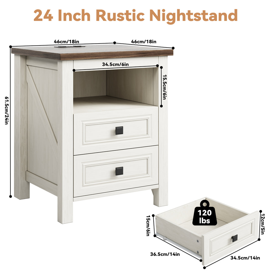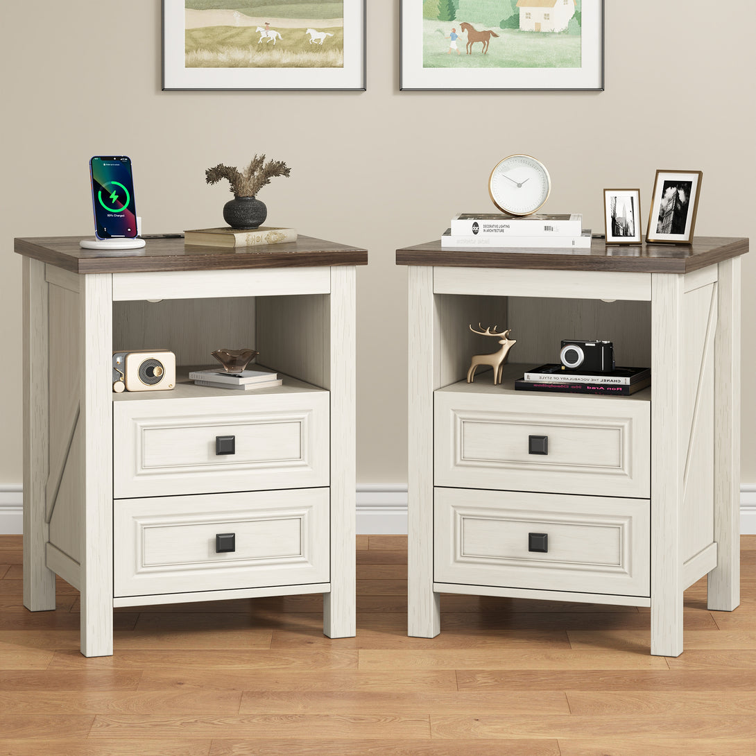 Nightstand with Charging Station, Rustic Bedside Table Farmhouse Nightstand with 2 Drawers End Tables Night Stand for Bedroom Living Room