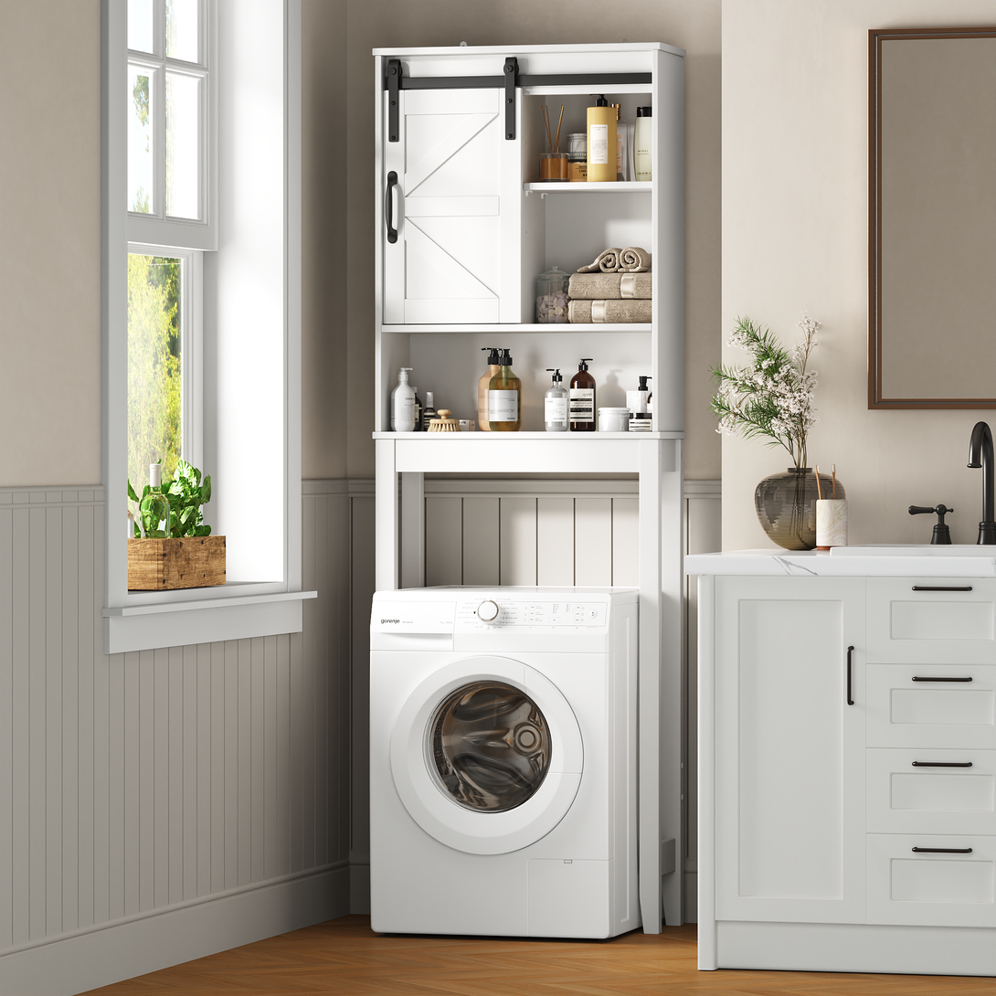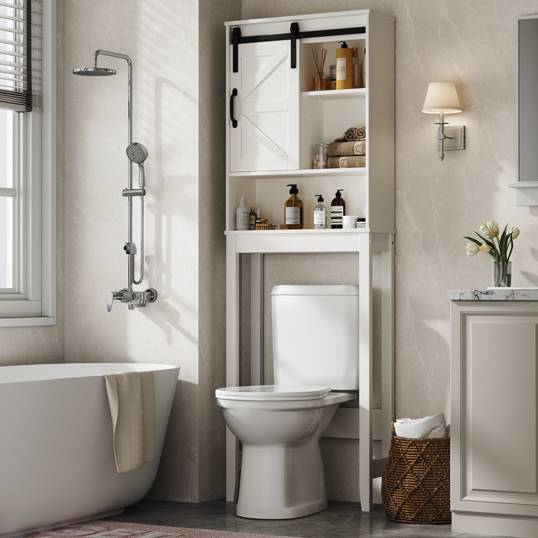 Over the Toilet Storage Cabinet, Rustic Storage Cabinet Over Toilet with Sliding Barn Door & Adjustable Shelves, Farmhouse Space Saver Organizer for Bathroom,Living Room, White