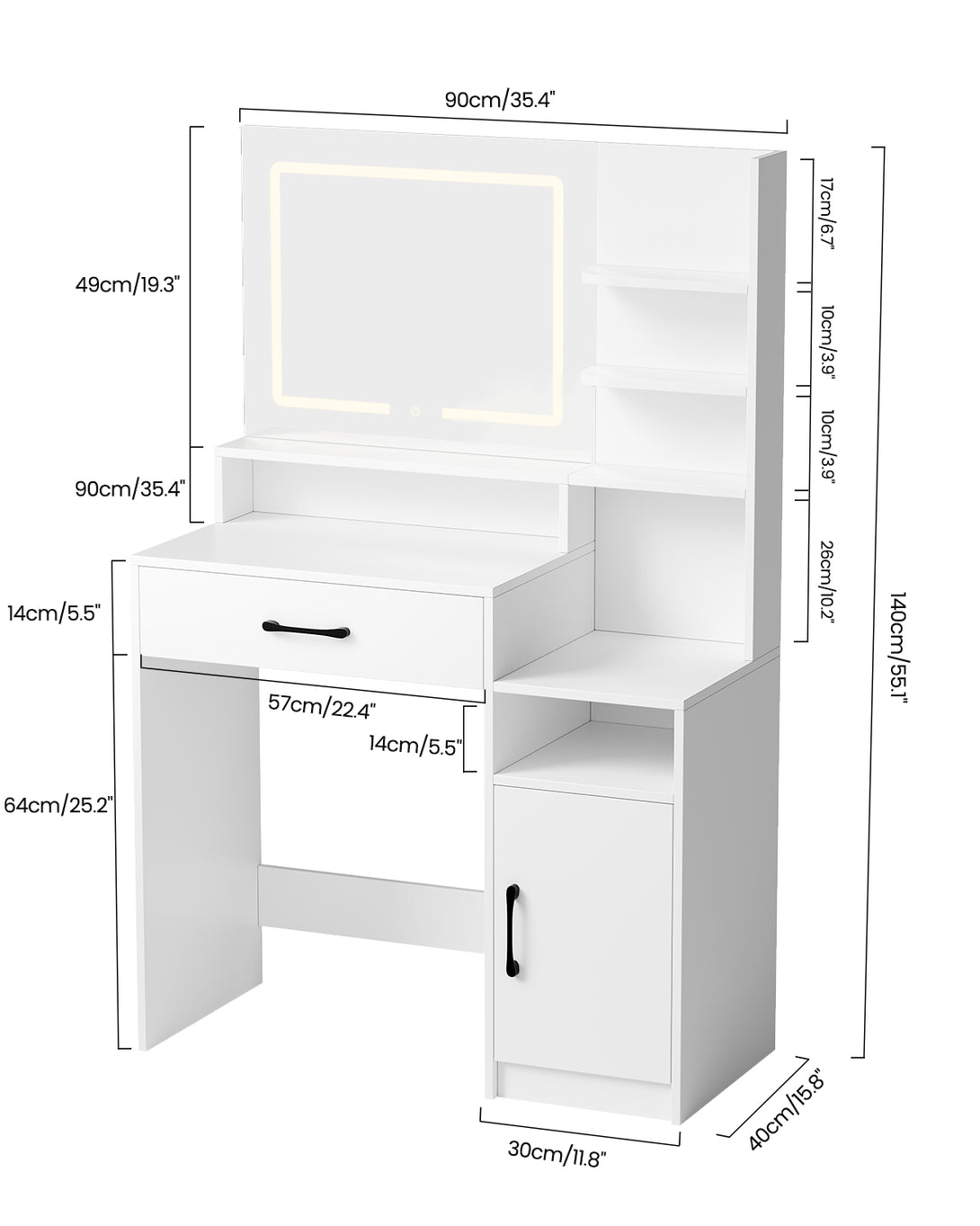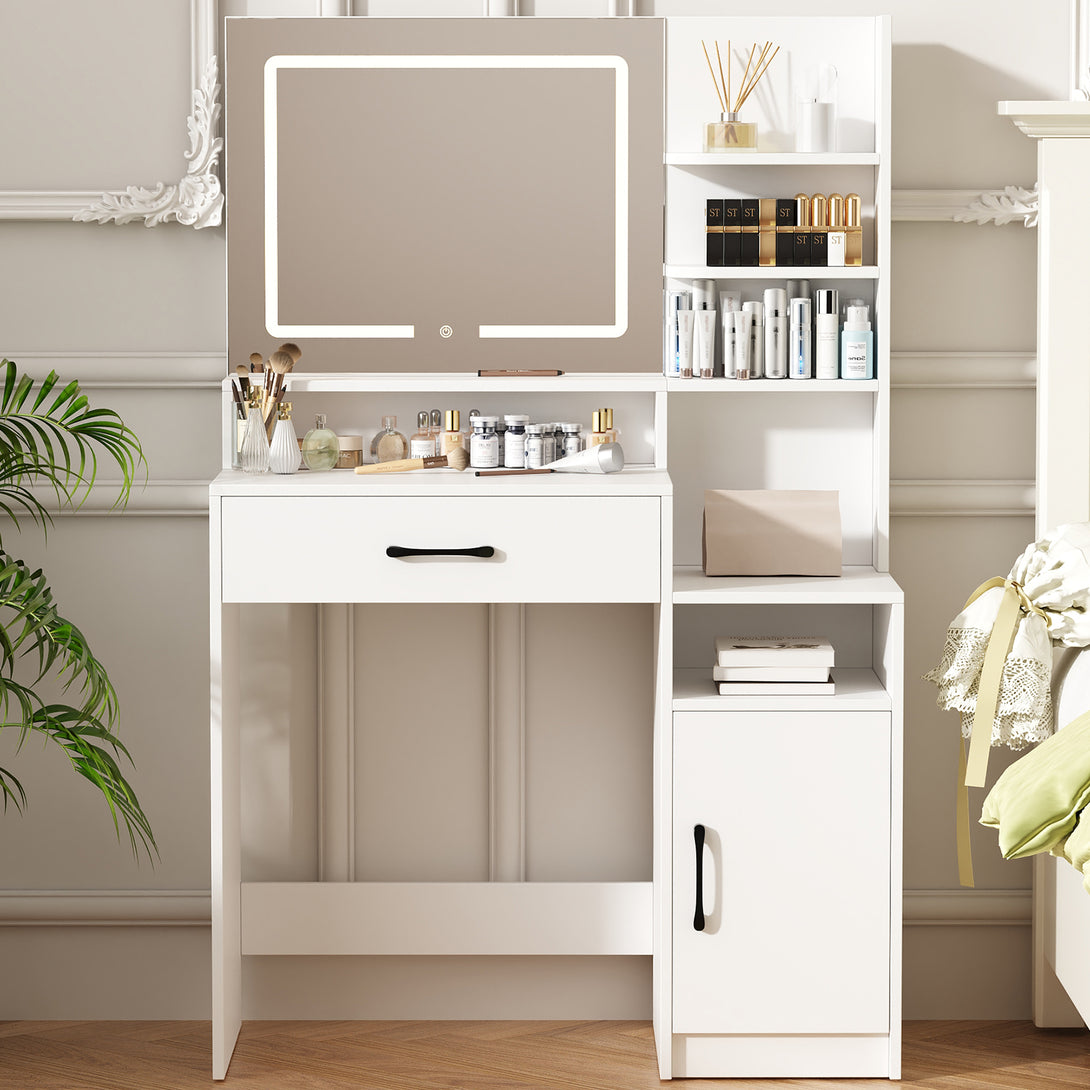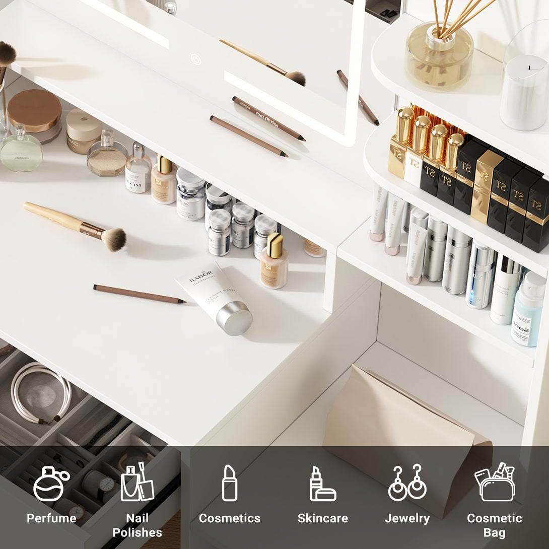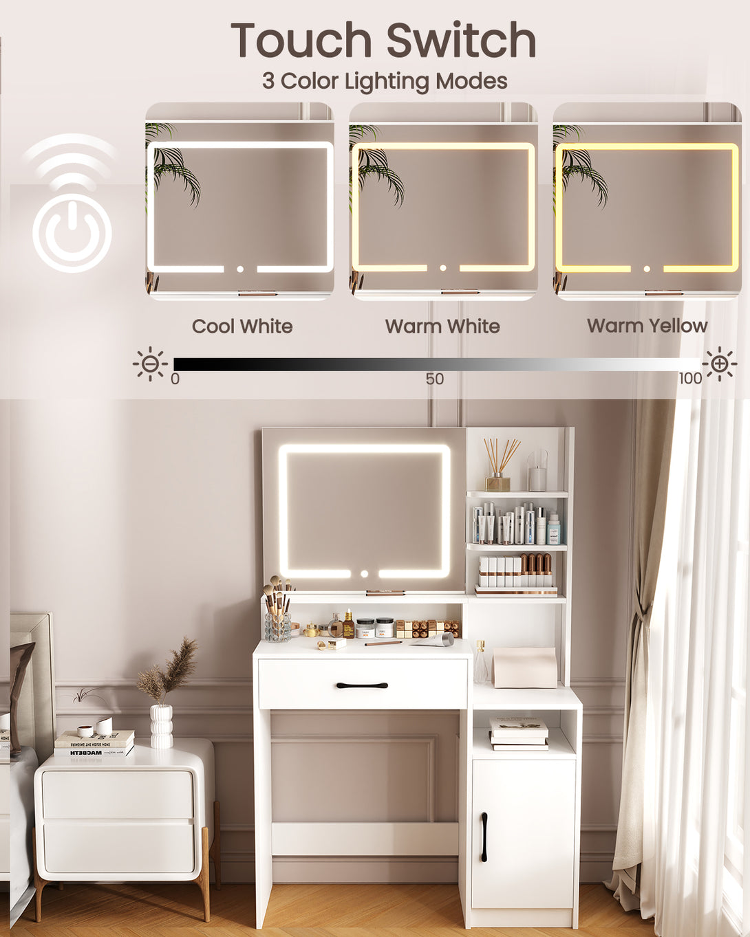 Enjoy a full-size makeup vanity mirror (Mirror Size: 22.4"L*19.3"W) complemented by LED strip lights offering three adjustable colors: cool white, warm white, and warm yellow. With a simple touch, effortlessly adjust brightness and color to suit different settings and makeup needs, providing a star-like makeup experience.