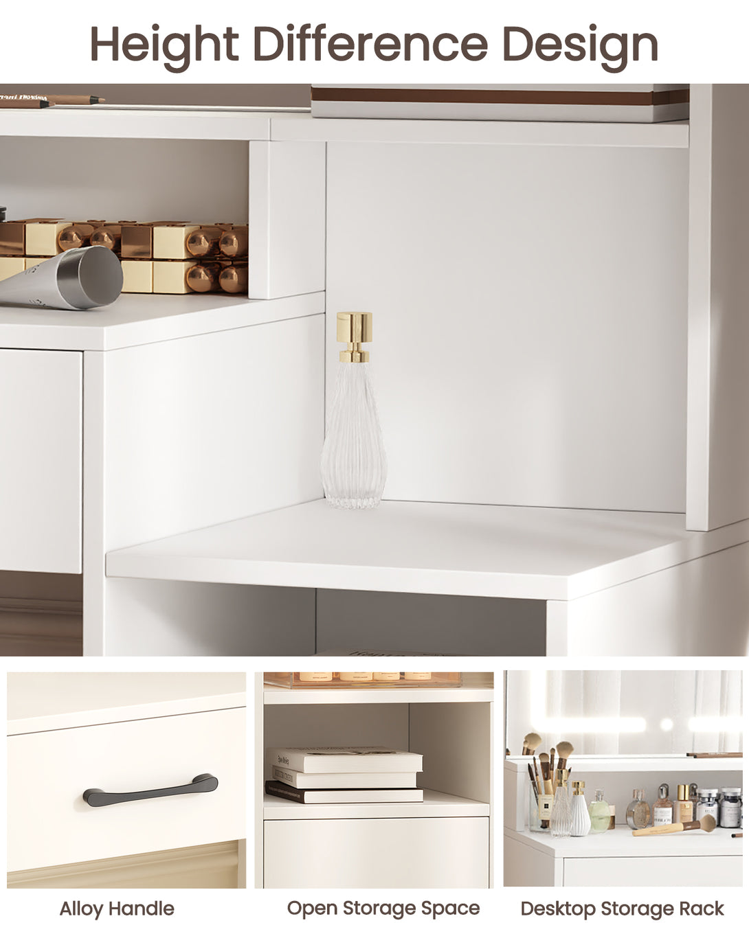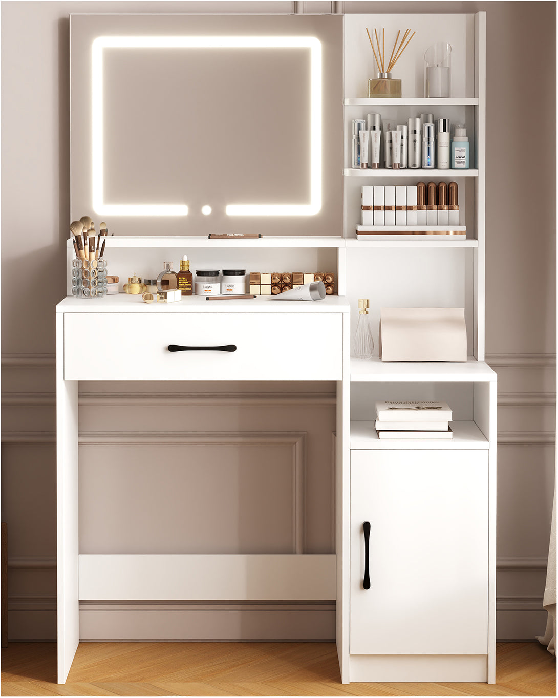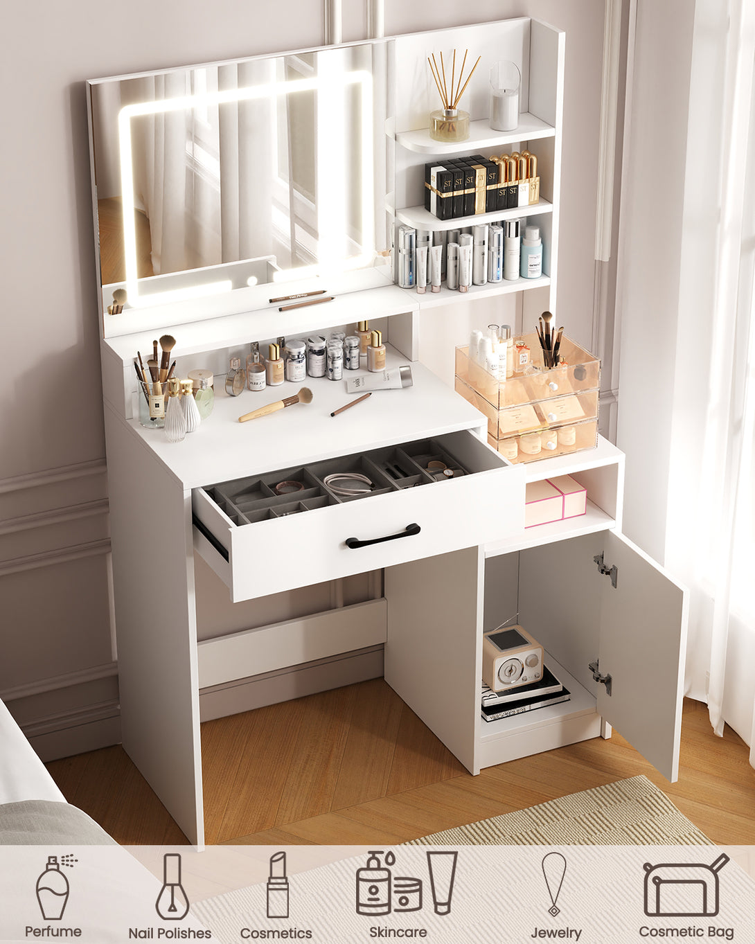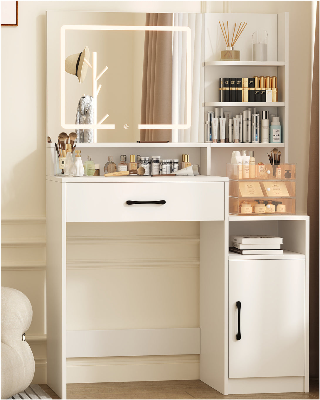 Enjoy a full-size makeup vanity mirror (Mirror Size: 22.4"L*19.3"W) complemented by LED strip lights offering three adjustable colors: cool white, warm white, and warm yellow. With a simple touch, effortlessly adjust brightness and color to suit different settings and makeup needs, providing a star-like makeup experience.